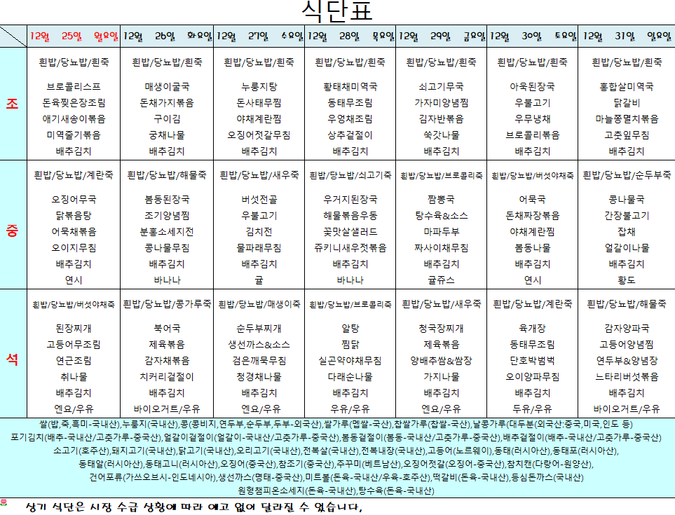 12¿ù ¸¶Áö¸·ÁÖ ½Ä´ÜÇ¥ÀÔ´Ï´Ù. |