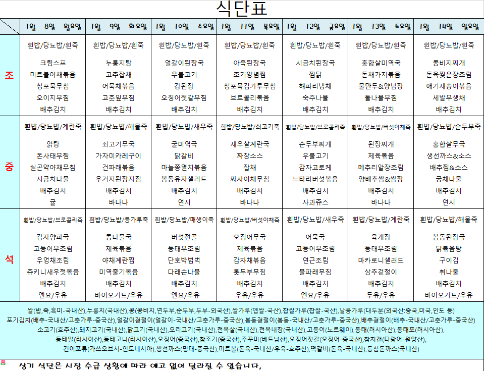 1¿ù ¼Â°ÁÖ ½Ä´ÜÇ¥ÀÔ´Ï´Ù.